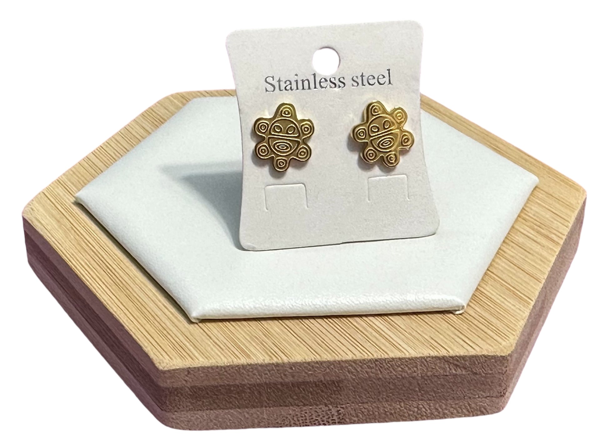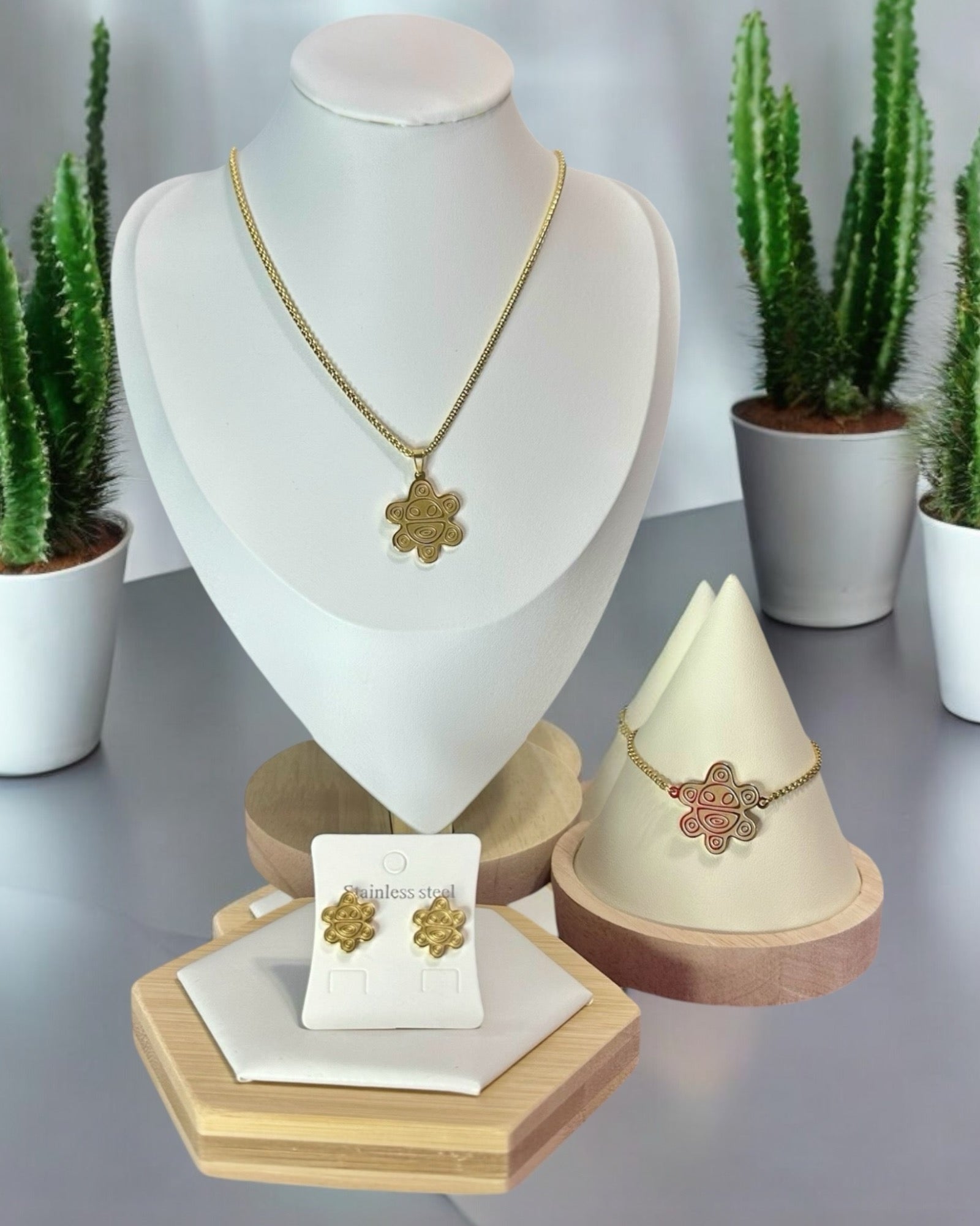 Set que incluye una Cadena con Charm del Sol Taíno en color Dorado. Además contiene una Pulsera Ajustable con el mismo charm. Incluye además unas Pantallas en combinación. Todas las Piezas son Stainless Steel 316. Las Cadenas varian en tamaños.