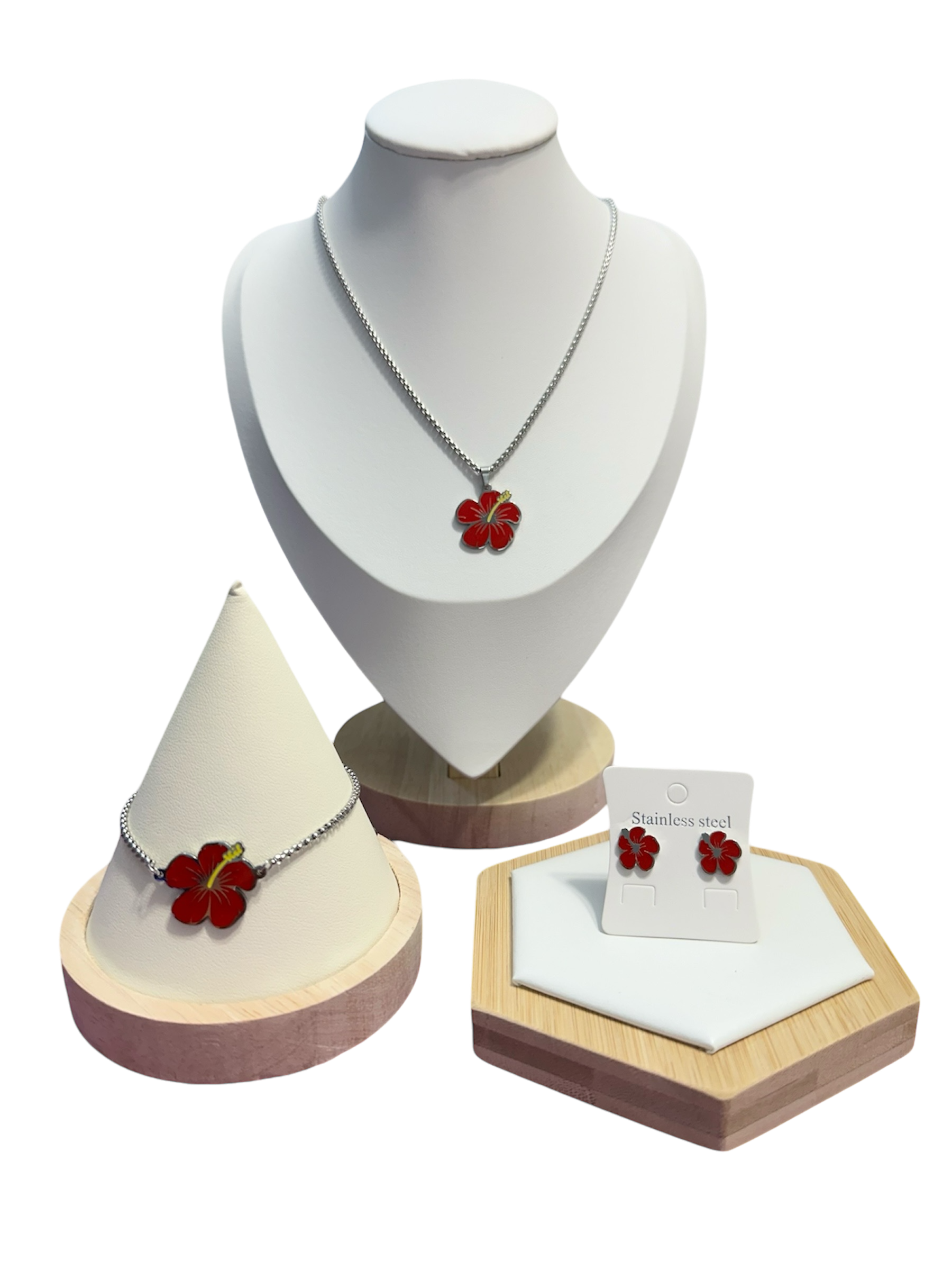 Set que incluye una Cadena con Charm de la Flor de Maga de Puerto Rico en color Rojo y Dorado. Además contiene una Pulsera Ajustable con el mismo charm. Incluye además unas Pantallas en combinación. Todas las Piezas son Stainless Steel 316. Las Cadenas varian en tamaños.