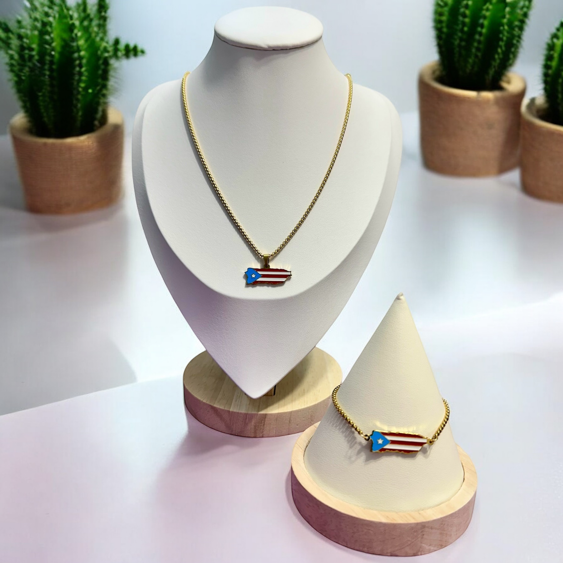 Set que incluye una Cadena con Charm de la Bandera de Puerto Rico con color y Dorado. Además contiene una Pulsera Ajustable con el mismo charm. Ambos son Stainless Steel 316. Las Cadenas varian en tamaños.